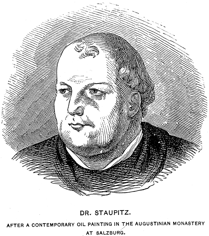 Johann von Staupitz, teólogo, profesor universitario, Vicario General de la Orden de San Agustín (agustino) en Alemania y superior del convento donde estaba de comunidad Martin Lutero, en 1522 abandonó la orden agustiniana para unirse a los benedictinos y ser abad de San Pedro en Salzburgo, 1524