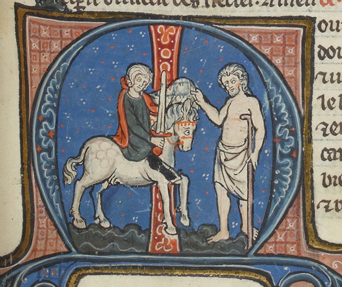 La leyenda más famosa en torno a su vida sucedería hacia el año 337, cuando estando Martín en Amiens encontró cerca de la puerta de la ciudad a un mendigo tiritando de frío, a quien dio su mitad de su capa de legionario (la otra mitad pertenecía al ejército romano). Cuando estaba soñando, Jesús apareció vestido con la media capa y dijo a una multitud de ángeles que le rodeaba «Martín, siendo todavía catecúmeno, me ha cubierto con este vestido». Esta es la escena que iconográficamente se ha preferido para su representación.